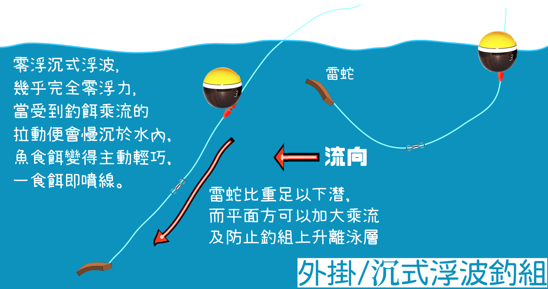 適用於魚排筏釣、浮子磯釣、黑吉、手竿及手繩直感,使用長度約1-3厘米,自重1厘米約1.1克左右。如魚排或大內灣靜水位,一般流速較慢,不加任何負重量,都可輕易潛入8米左右水深。雷蛇到泳層後會輕微上浮,經水流製造自然飄蕩效果,帶餌時餌會仿造魚瀕死時上下拍動形態,刺激大魚側線攻擊雷蛇。