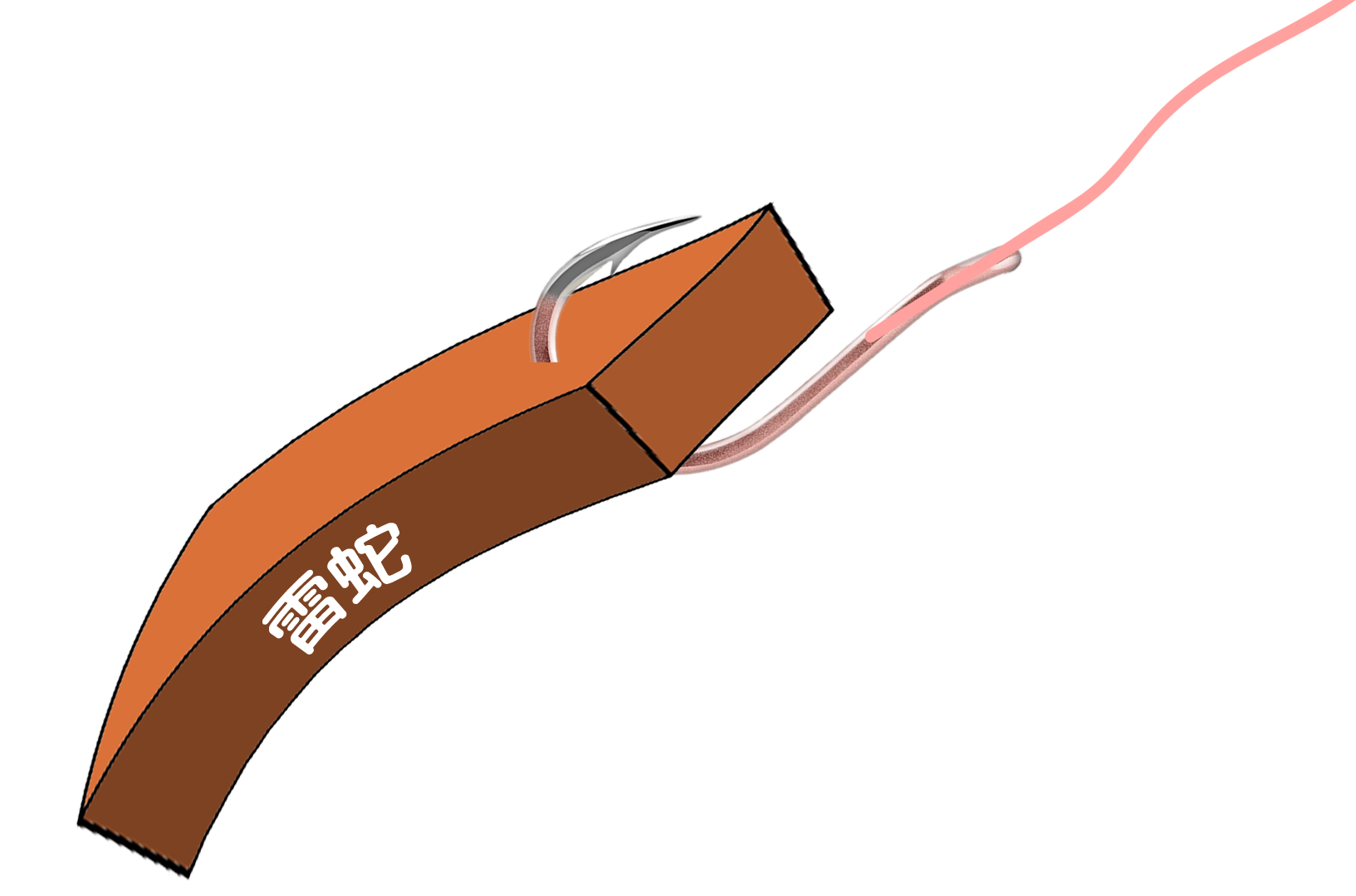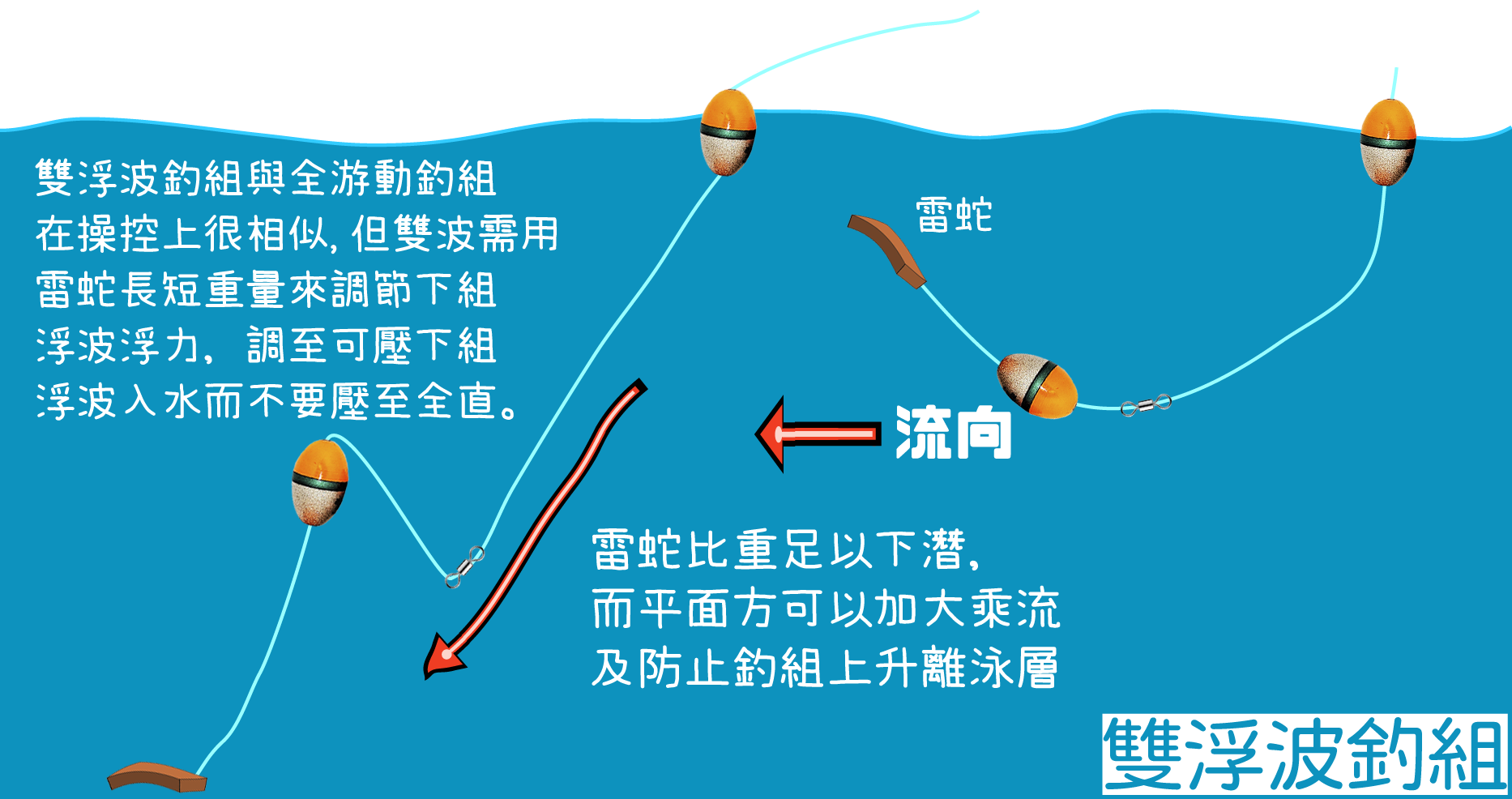 適用於魚排筏釣、磯釣、船筏及橋墩磯筏,使用長度約3厘米,自重1厘米約1.1克左右。在綁鈎時(主鈎建議使用鴻光管付千又4號鈎或以上)把魚絲結尾加長,加長的線綁底鈎(底鈎建議使用鴻光管付千又1號鈎),將底鈎拉入煉丸中(建議使用高擴散型的鴻光煉丸如爆丸),兩者有足夠重量快達泳層,到達水底時把魚絲收緊,以煉丸貼底,雷蛇離底為準,而雷蛇會被水流沖刷製造擺動引魚。雷蛇耐咬性強,高擴散型煉丸擴散快,會加速聚集細魚及引大魚入攻擊點,而雷蛇會負起頂細魚及等大魚任務進而誘釣同步。