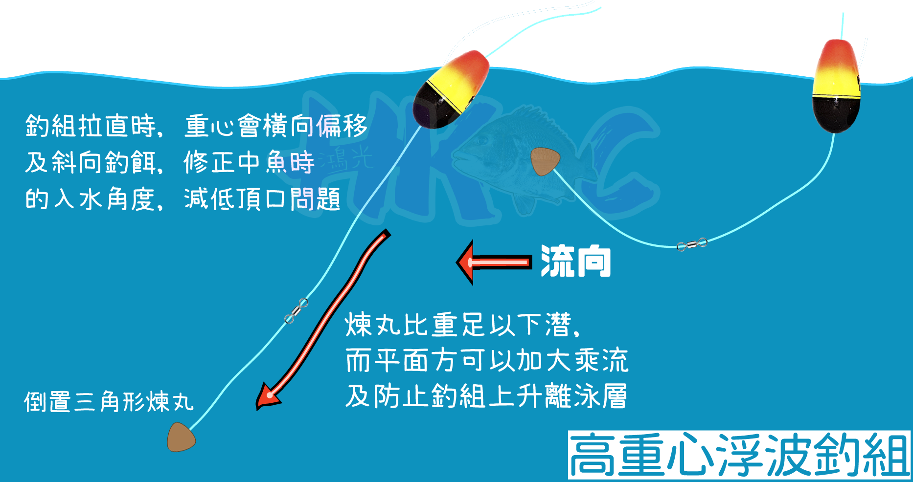釣點側風、逆風大或湧口大,用浮波會易拋投及操控,煉丸最好設定為倒置三角的不規則形,因煉丸有一定自重,容易下沉及拉直釣組,而煉丸闊面可有效防止水面的滯線被浪湧拉至脫離設定的攻擊泳層。