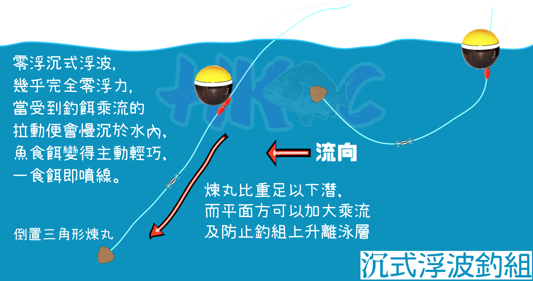多了一粒用在子線上的浮波,半游動或全游動皆可。多用在較靜底流的釣位捕捉底流方向,在水底下加大乘流性及釣餌的自然度,於全游動時入在水內的子線浮波只有極輕量浮力,當魚吃餌時那微弱的頂口感,反而加大魚的追食,當水面浮波一沉,幾乎肯定魚已入扣,但大風時用會因折點多容易糾結。