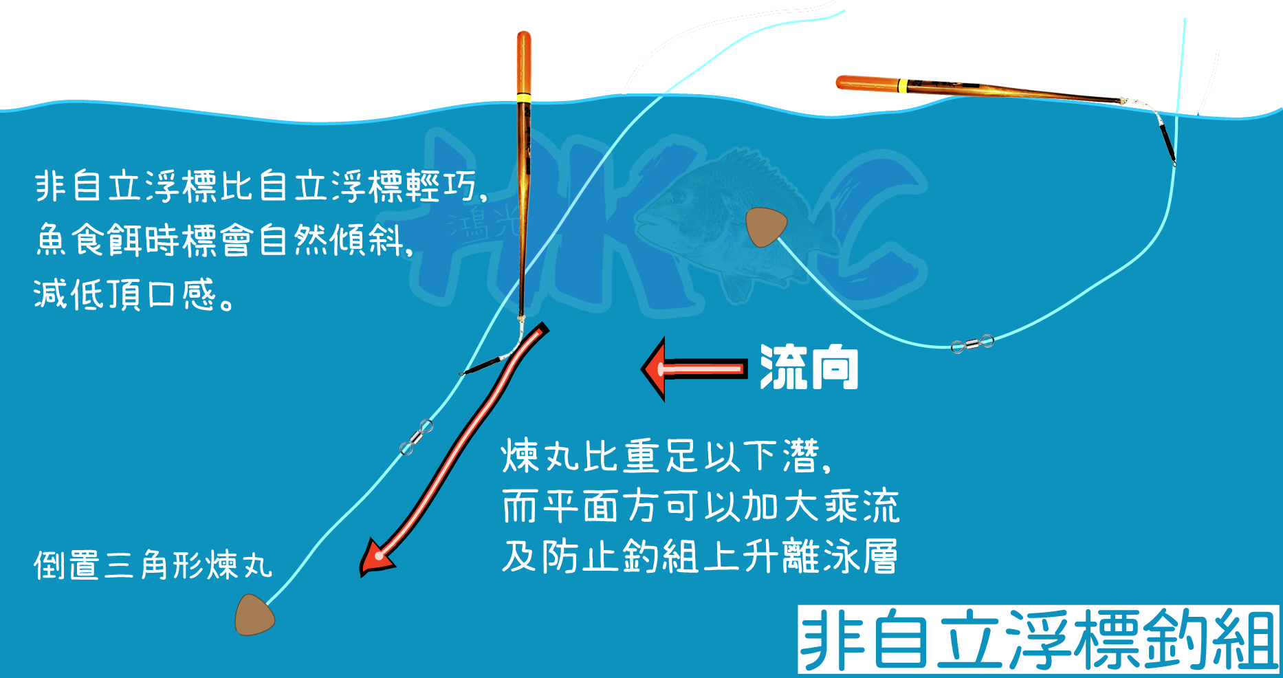 當魚逆流進入標點吃餌時,如正面出現的是釣餌而不是釣線,魚戒心會降低許多,控竿控至煉丸先行,散出的食物味道更能發揮誘釣同步,並可隱藏釣組加大中魚機會,當中有合適的工具去幫助及改善釣組形成傾斜角度。例如: